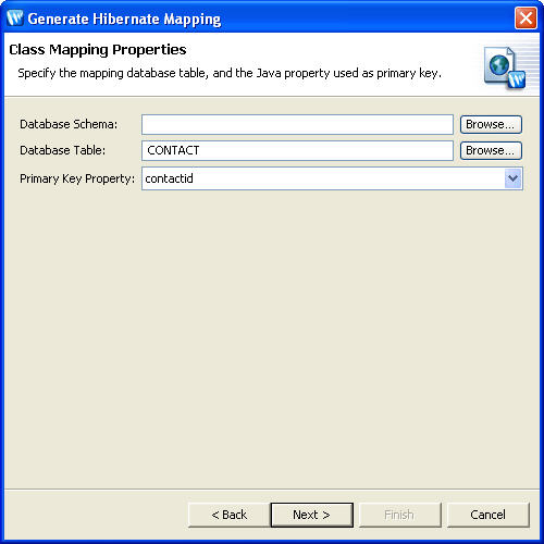In this step, you will create a persistent java class Contact and use Workshop to generate Hibernate mappings for the Contact object. This way, we will follow a top-down development scenario.
