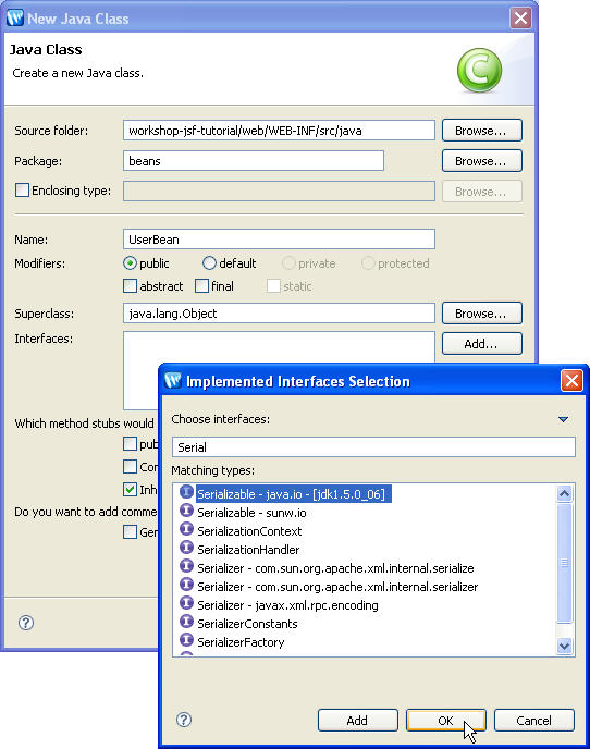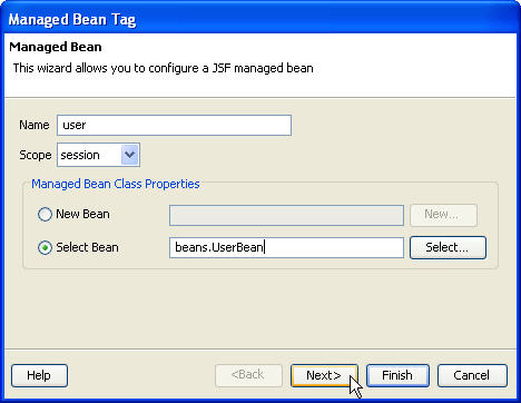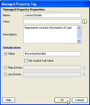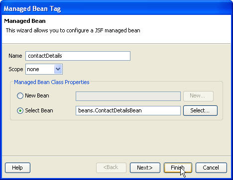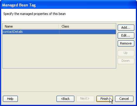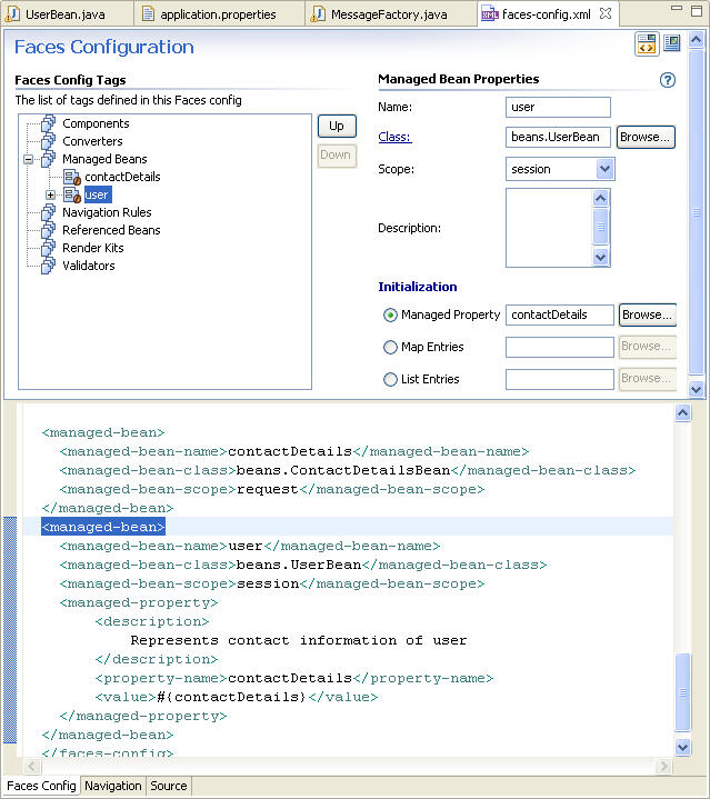The UserBean has a property contactDetails of bean type ContactDetailsBean. Hence, we first define managed-bean configurations for ContactDetailsBean and then for the UserBean.