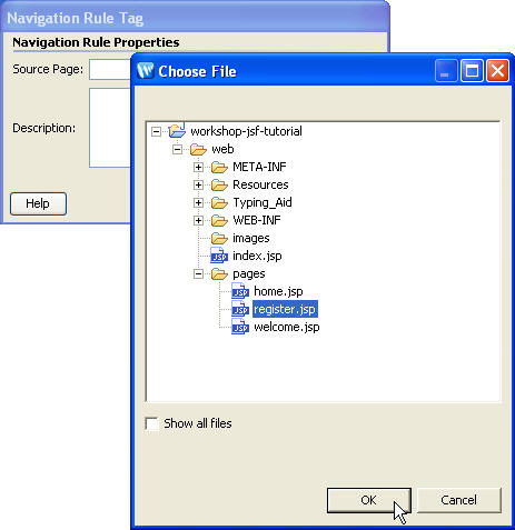 - Right-click the navigation rule pages/register.jsp and