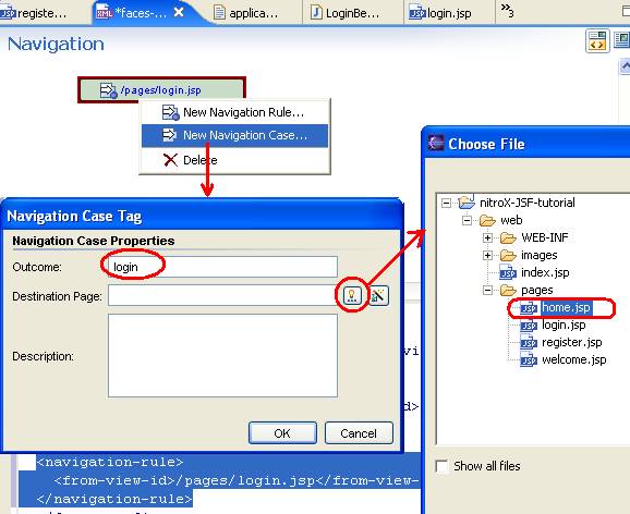 - Define new navigation case for the navigation rule /pages/login.jsp