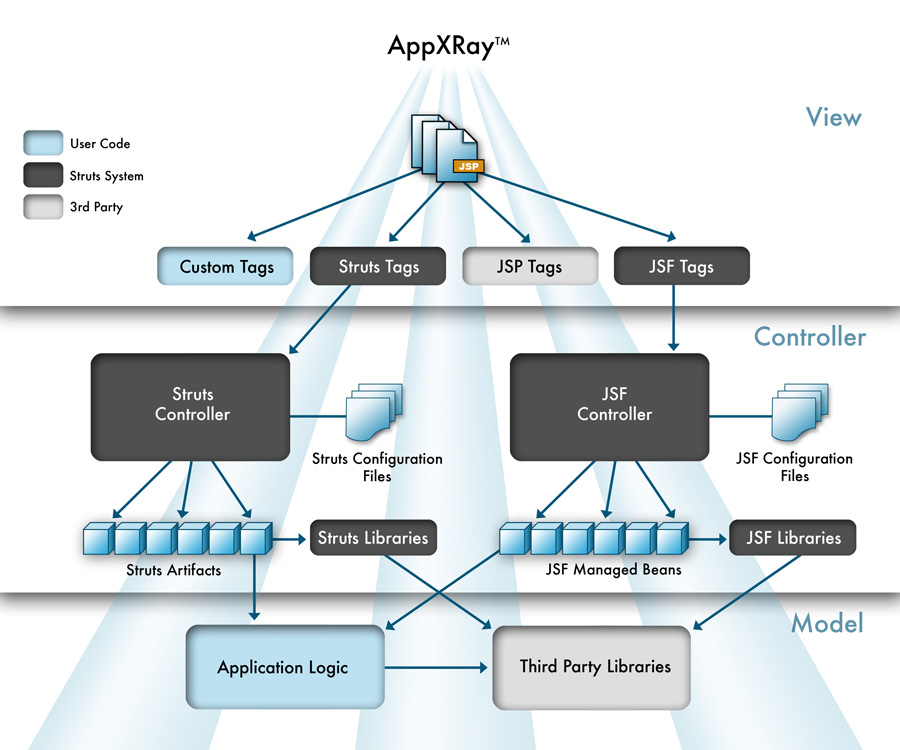 The Workshop group of products incorporate AppXRay, which scans all of the elements of imported web applications and creates an intelligent map of the relationships between them. These elements include Java application logic, JSP files, Struts artifacts, JSF artifacts, web and configuration XML files, resource bundles, application variables, properties, etc. As the application is scanned, AppXRay dynamically builds an application database of this intelligence. The database is incrementally updated as you make changes to the web application. The AppXRay capabilities provide an incredibly high level of productivity in creating, editing, or debugging any part of your web application.