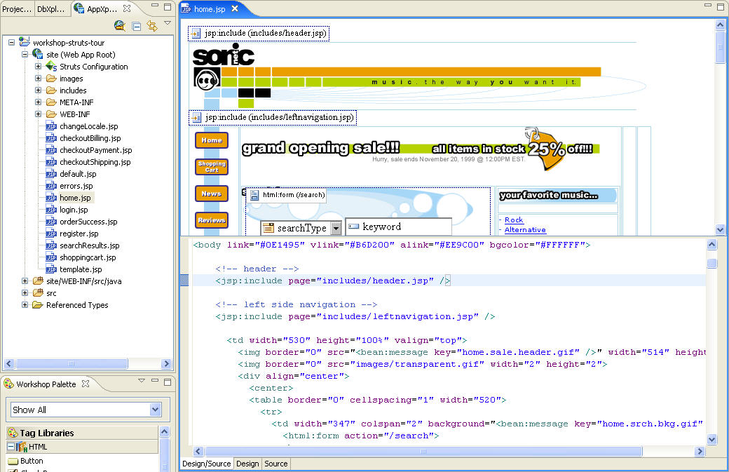 Workshop provides an advanced visual editor which allows you to compose web pages visually through a design editor or through direct manipulation of markup in a source editor. Workshop also provides a compound editor mode in which the source editor and design editor are available simultaneously. This allows for source-level editing but still provides real-time visual feedback of design changes as you edit your web page. You will spend more time learning how to use Workshop to edit your web pages in later exercises.