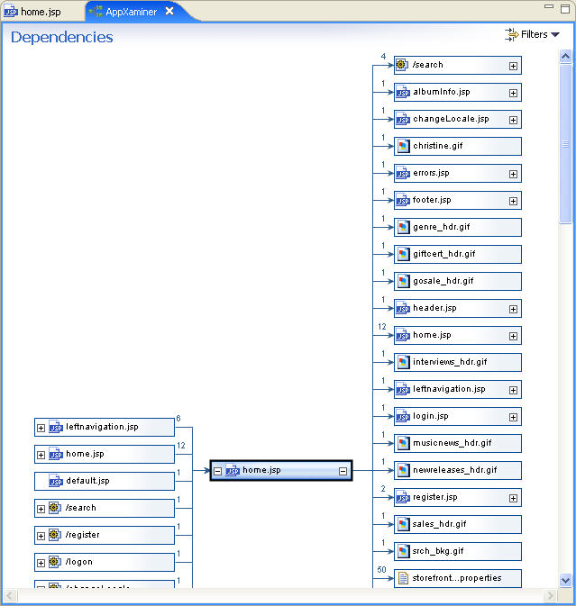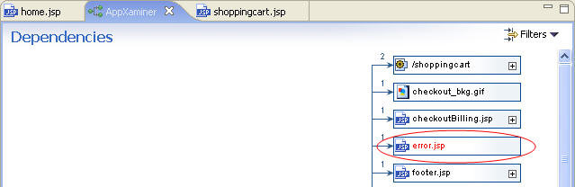 2. AppXaminer outlines all of the dependencies going into and coming out of the home.jsp node. Expanding the branch next to a resource, such as errors.jsp, allows you to easily drill down through multiple levels to analyze the dependency chain and traverse the flow through the application. Double-clicking a dependency will open in it in the appropriate editor.