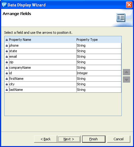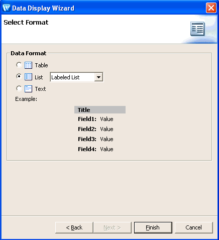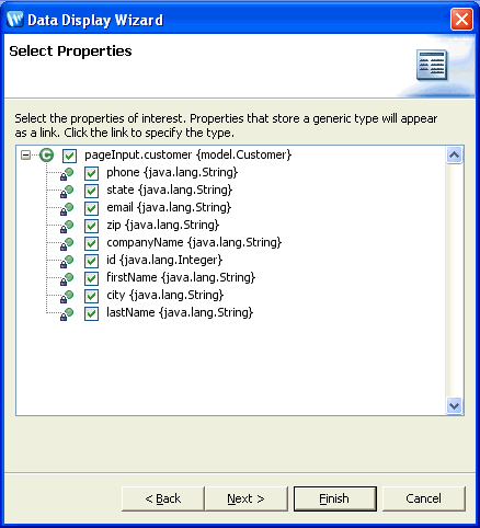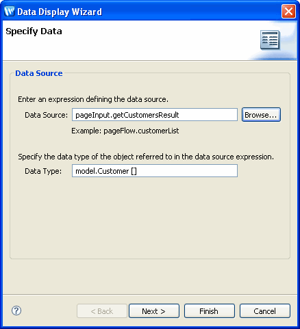 Note: the Data Display wizard is offered as a choice when complex Java types or repeating types (arrays, collections, etc.) are dragged and dropped from the Data section of the Design Palette.