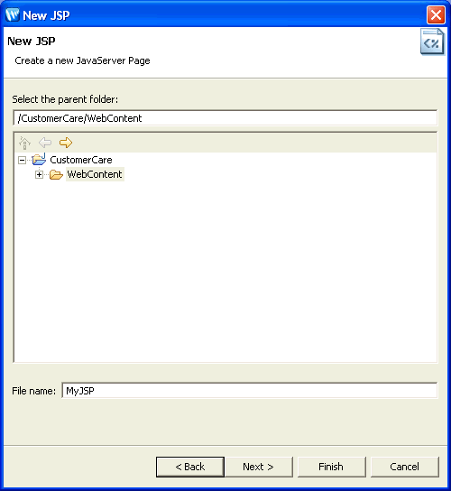 This page lets you select the name and location of the new JSP page.