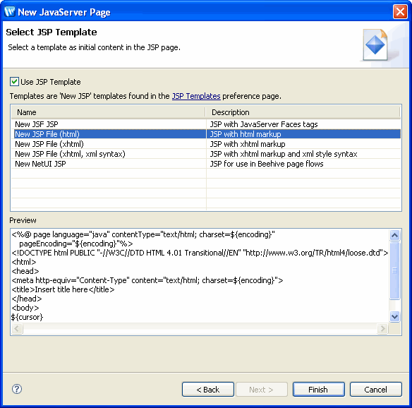 This page lets you select from the available JSP templates, if desired. The wizard will remember your JSP template selection and use the same template by default the next time you launch the wizard.