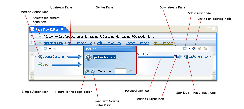 The following diagram points out the main areas, icons, and buttons available on the Page Flow Editor View.