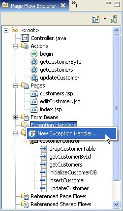 For example, to add a new exception handling method to the page flow, right click the Exception Handlers node and select New Exception Handler.