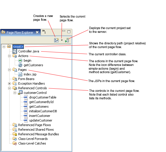 The Page Flow Explorer View gives you an overview of the functional parts of a page flow, including actions, JSPs, controls, exception handlers, etc.