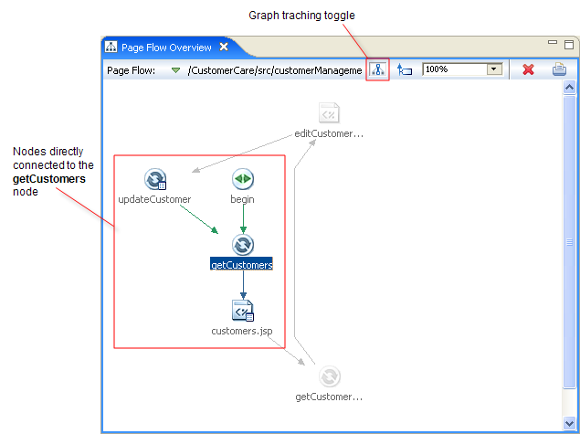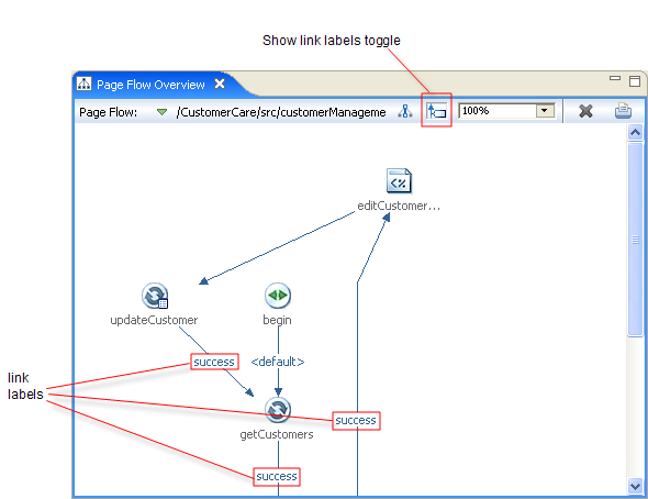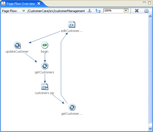 The Page Flow Overview gives a complete view of a page flow, including all of its pages, actions, and forwards.