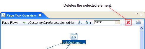 Editing through the Page Flow Overview is limited to the deletion of a selected element. The red X button will delete the selected page, action, or forward.