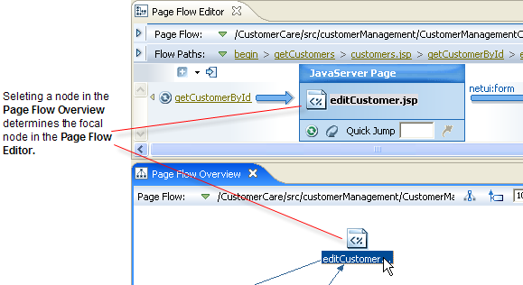 The focal node in the Page Flow Editor syncs with the selected node in the Page Flow Overview.