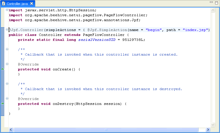 The Source Editor view shows the source for a Java file, JSP file, etc. All of the views in the Page Flow perspective are synchronized with the Source View for two-way editing.