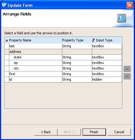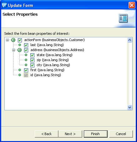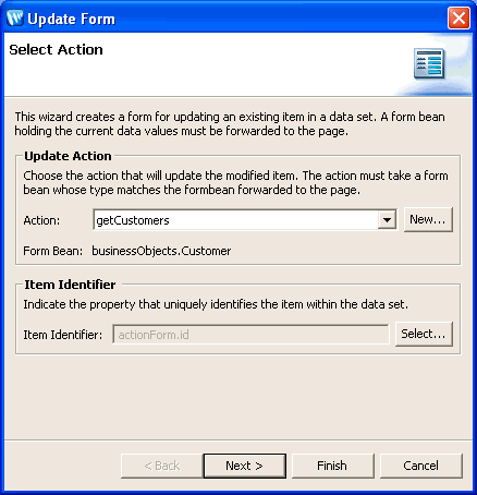 To open this wizard, open a JSP file in the Page Flow perspective. Then drag and drop the Update Form entry from the NetUI section of the Design Palette onto the source view of the JSP.
