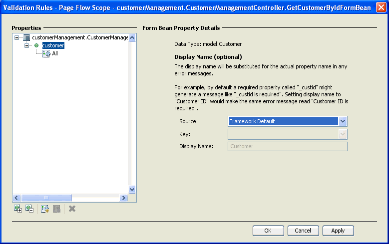 (3) Page Flow Default Message Bundle: on this setting, the value of Display Name specifies the message key used to retrieve the error message from the default message bundle. (To set the message bundle file, see Validation: Set Message Bundle.)