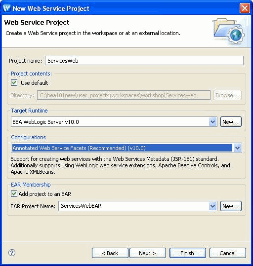 - Select the Add project to an EAR check box and ensure that ServicesWebEAR is selected in the EAR Project Name box.