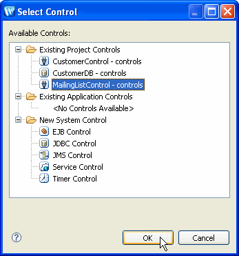 In the Select Control dialog, note that you can choose from various existing controls, including MailingListControl, the one you created earlier in the controls package.