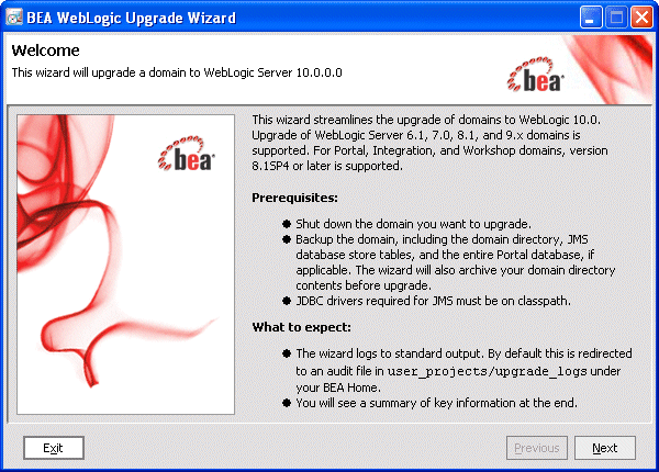 The 10.0 WebLogic Upgrade Wizard allows you to upgrade domains created in WebLogic Server 7.0 or 8.1.