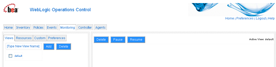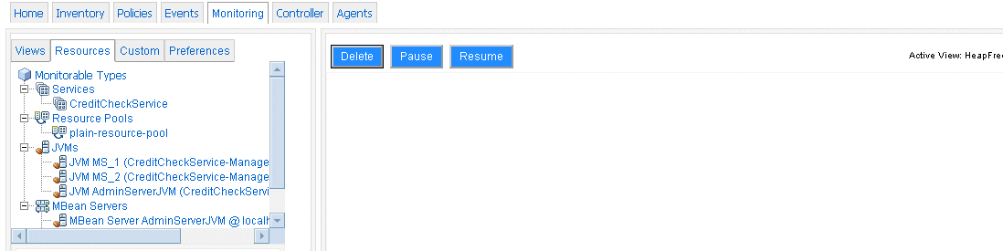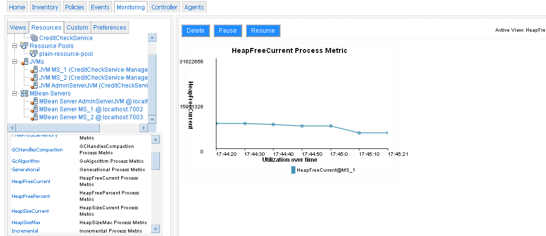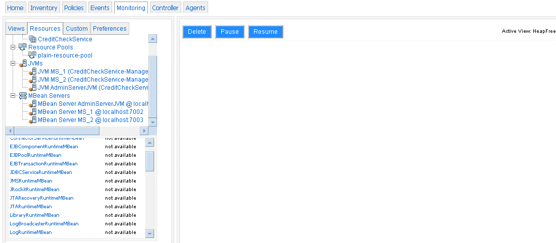 When you select the Resources tab, it displays a list of the resources that you can monitor. Using this pane, you can monitor the CPU and memory usage for the services, resource pools, and JVMs. You can also monitor the values of one or more MBean attributes, over time, for each of the MBean Servers.