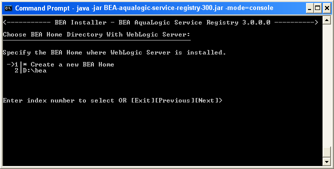 —Go to Installation Type.The following figure shows the BEA Home Directory command window.