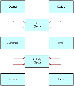 Figure 20 illustrates the database schema for the application. It shows a schema with two main fact tables (Activity and SR) and their associated dimension tables. The two fact tables share the Customer and Time dimension tables. CAUTION: It is the administrator's responsibility to verify data consistency and integrity. For example, if you create a new data set that contains new dimensional records and do not update the corresponding facts data set, the mobile database might provide incorrect results. Static DimensionsStatic dimensions are dimension tables that do not change for long periods of time, if at all. For example, a dimension table of United States zip (postal) codes could be a static dimension for most applications. Because static dimensions do not change often, mobile users typically need to download them only once. Therefore, administrators should put all static dimension tables for a mobile application into a separate data set. The Customer Interaction application example in Defining Multiple Data Sets has one static dimension (Time). Database administrators typically preallocate many years worth of time data. As a result, the table does not change for years at a time. For example, in the Customer Interaction application, the Time dimension contains static data through the year 2010. Example of a Data Set for a Time DimensionThe following is an example of the data set definition for the Time dimension.