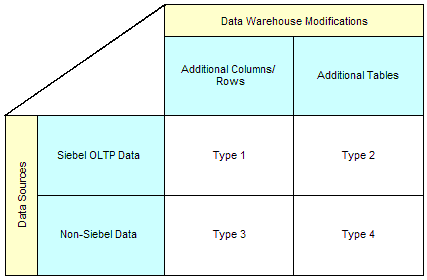 In customizing the Siebel Data Warehouse, various scenarios are available to you based on whether the data source is the Siebel transactional database (OLTP) or data from a non-Siebel source. The matrix in Figure 15 shows categories of customization scenarios. The kinds of customizations available for each category are described in Table 54. For instructions on how to perform the customizations, see Customization Steps for Siebel Data and Siebel Data Warehouse Customization Steps for Non-Siebel Data." For detailed information about ETL processes and tables, see Siebel Data Warehouse Data Model Reference.
