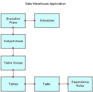 The DAC repository stores application objects in a hierarchical framework that defines a data warehouse application. A data warehouse application comprises the following repository objects: