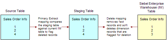 Figure 15 shows the primary extract and delete process that occurs when day two's information is extracted and loaded into the Oracle Business Analytics Warehouse from the source. The initial extract brings record four into the Oracle Business Analytics Warehouse. Then, using a primary extract mapping, the system extracts the Key IDs and the Source IDs from the source table and loads them into a primary extract staging table. The extract mapping compares the keys in the primary extract staging table with the keys in the most current the Oracle Business Analytics Warehouse table. It looks for records that exist in the Oracle Business Analytics Warehouse but do not exist in the staging table (in the preceding example, record three), and sets the delete flag to Y in the Source Adapter mapplet, causing the corresponding record to be marked as deleted. The extract mapping also looks for any new records that have been added to the source, and which do not already exist in the Oracle Business Analytics Warehouse; in this case, record four. Based on the information in the staging table, Sales Order number three is physically deleted from Oracle Business Analytics Warehouse, as shown in Figure 15. When the extract and load mappings run, the new sales order is added to the warehouse.
