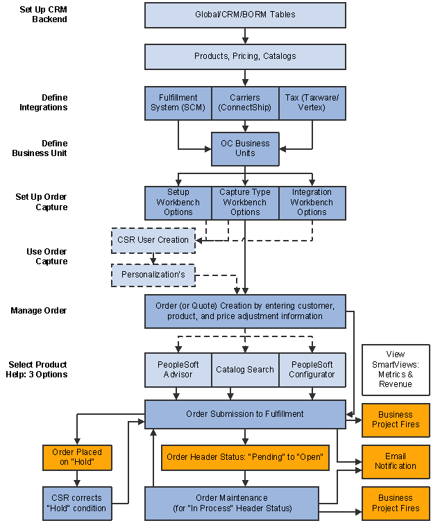 Order Capture provides integration with both PeopleSoft and third party fulfillment systems or supply chain management products. For example, there is a tight integration with PeopleSoft Supply Chain Management (PeopleSoft SCM) so that order fulfillment and detailed maintenance activity is possible.