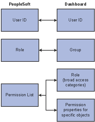 For every PeopleSoft user who is a dashboard user, the synchronization process creates dashboard groups for every one of the users roles. This includes the three PeopleTools roles that are used to identify dashboard users as well as the user's other roles. The synchronization process also adds dashboard users to these groups so that user-to-group associations on the dashboard side exactly match the user-to-role associations on the PeopleSoft side.