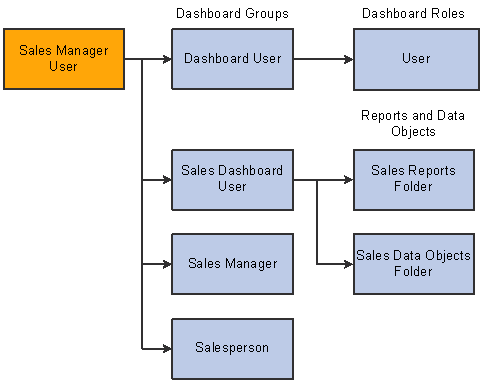 In this example, a sales manager has, in addition to the general-purpose Dashboard User role, the additional roles: Sales Dashboard User, Sales Manager, and Salesperson. The synchronization process created groups for all three roles and added the manager to all of these groups. Because the manager is associated with the Sales Dashboard User group, the manager automatically has access to the reports and data objects in the PeopleSoft Sales Dashboard application.