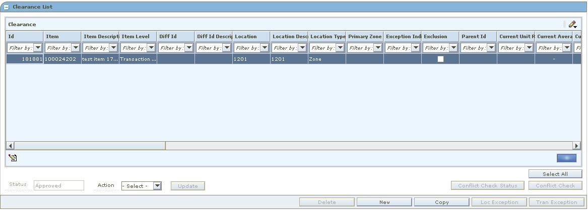 Click Tran Exceptions. The item selection area of the Clearance Maintenance pane is enabled.