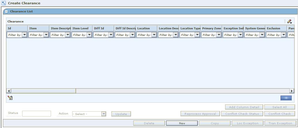 When a clearance is added to RPM, it must go through a series of checks before it can be applied to an item/location. Depending on your user role, you may not be able to move the clearance to the next status. A clearance may be in any of the following statuses: