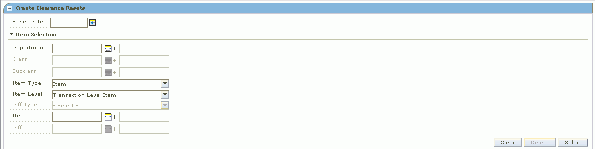 In the Item Selection area, select items on the clearance resets using the available fields.