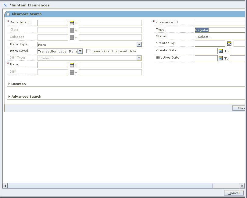 In the Location field, enter the ID of the location where items are different than the zone on the clearance, or click the LOV button and select a location.