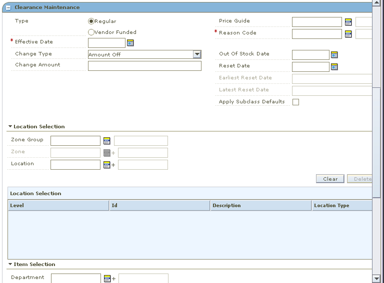 In the Clearance Maintenance pane, in the Item Selection area, select items on the clearance using the available fields.