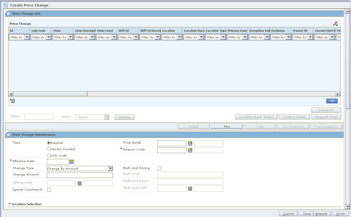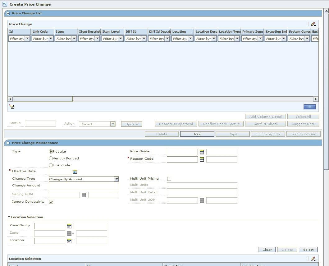 The Create Price Change workspace allows you to establish the price changes for an item or group of items at a location or group of locations. When you open the window, the Price Change List and Price Change Maintenance panes open. After you create your price change in the Price Change Maintenance pane, it is added to the Price Change List pane.