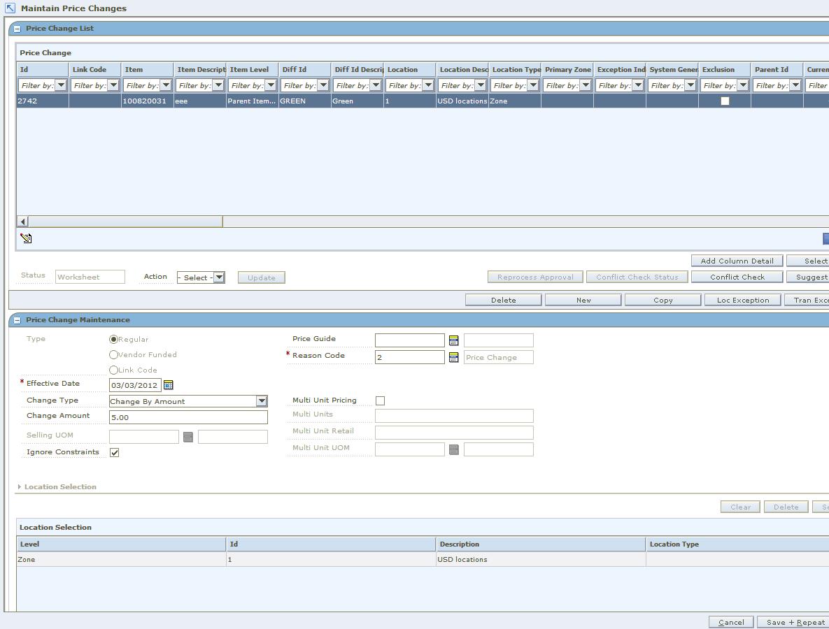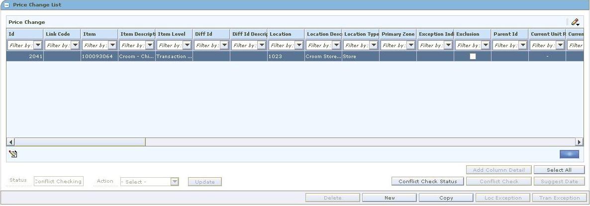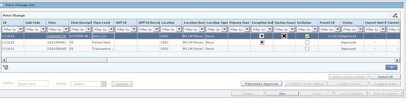 After you create a price change, you can maintain different aspects of the price change. You can create exceptions to the items and locations that exist on the price change, change the specifics of the price change, and can copy an existing price change.