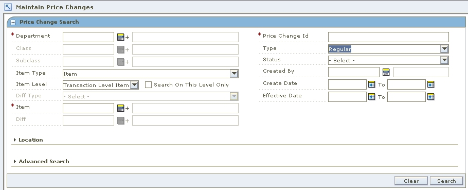 Select criteria in the following fields to search for price changes in a specific merchandise level: