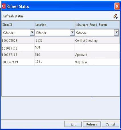 In the Clearance Maintenance workspace, click Conflict Check Status. The Refresh Status window opens.