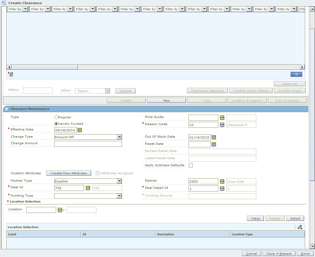 After you create a clearance, you can maintain different aspects of the clearance. You can create exceptions to the items and locations that exist on the clearance, change the specifics of the clearance, and can copy an existing clearance.