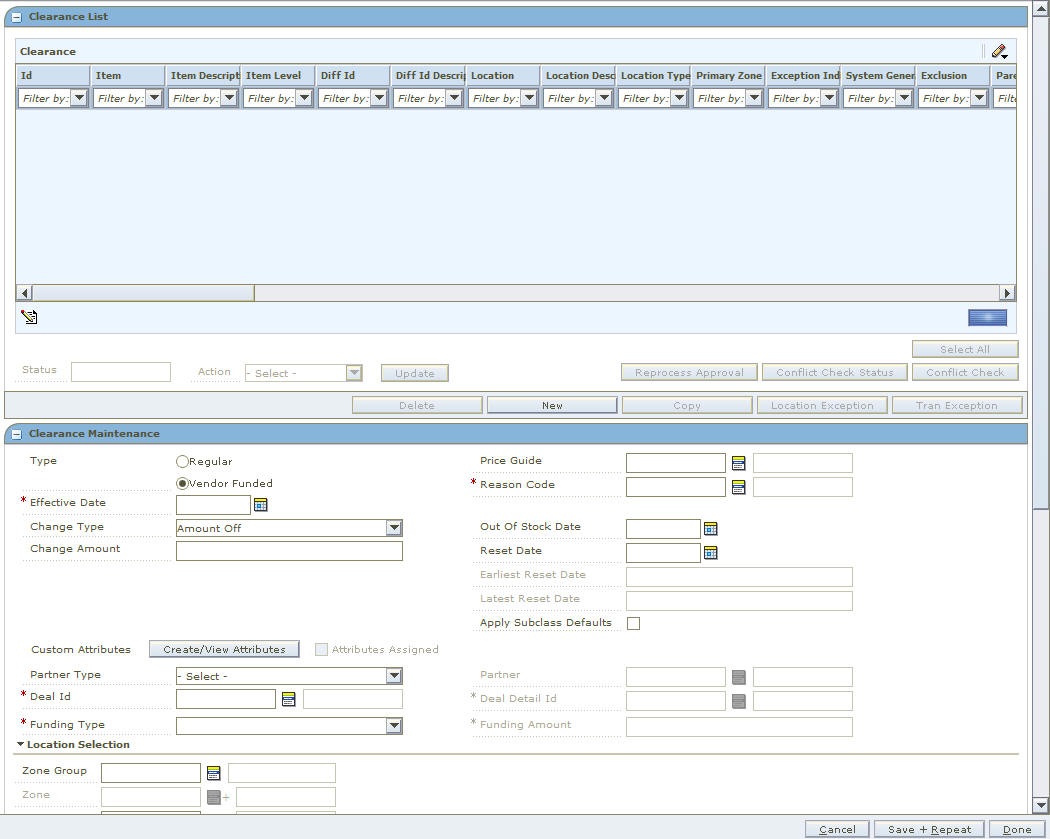 Zone Group - Enter the ID of the zone group that contains the locations to add to the clearance, or click the LOV button and select a zone group.