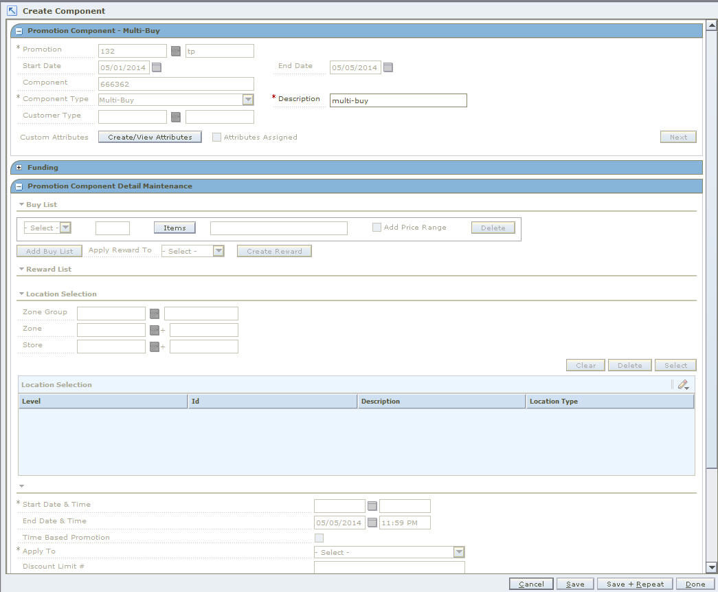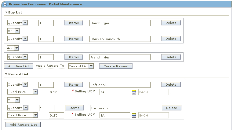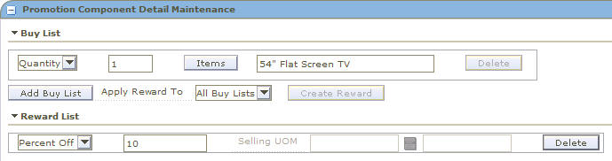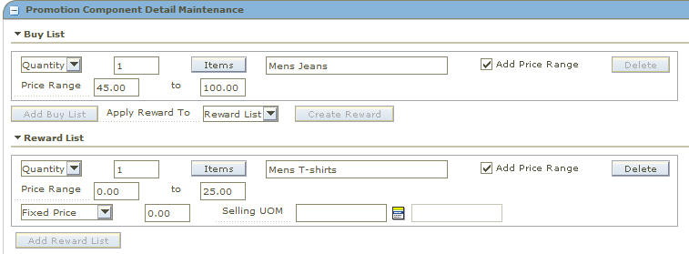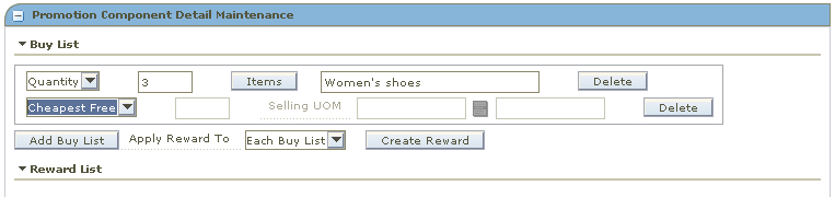 Multi-Buy Component - A multi-buy promotion component consists of an item, item group, or merchandise level. You can define the quantity of items or amount of purchase required for the customer to receive a discount or reward. For example, a promotion might include a reward of a third pair of shoes free with the purchase of any two pair of shoes from selected items or item groups. Another promotion might allow purchase of any five items from selected item groups at a fixed price or discount. See "Examples of Multi-Buy Components" for more detailed examples.
