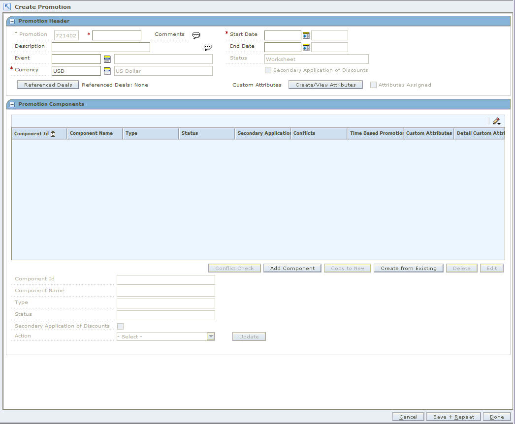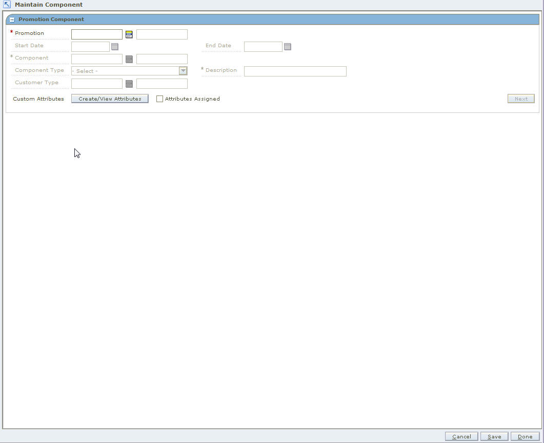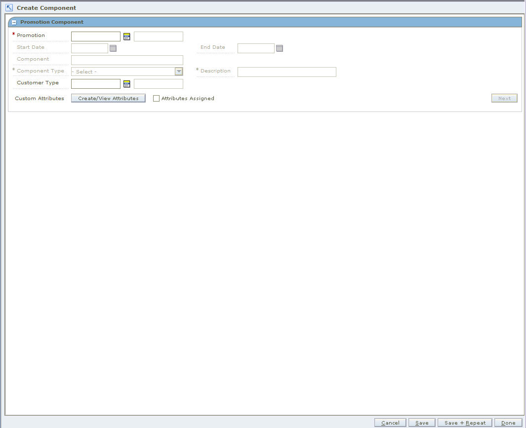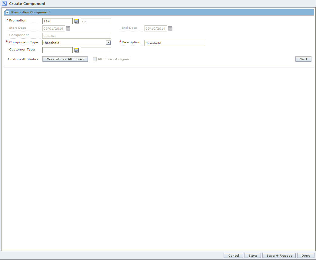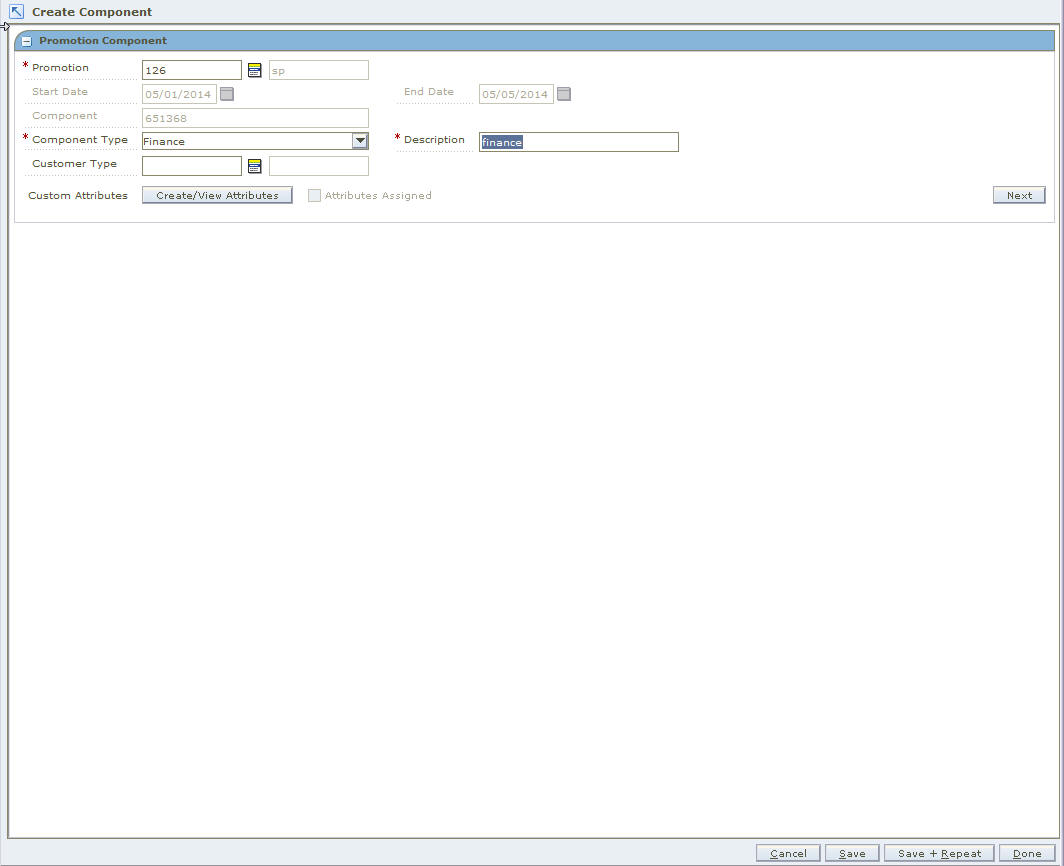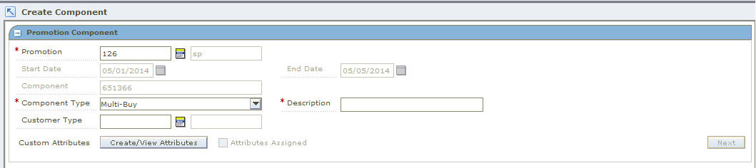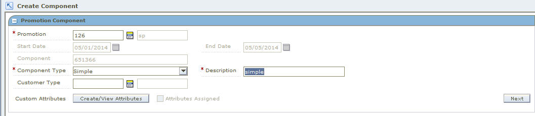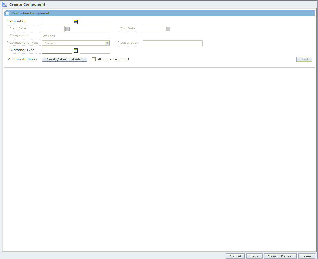 Click Next. The Promotion Component Detail Creation window opens, or click one of the following options: