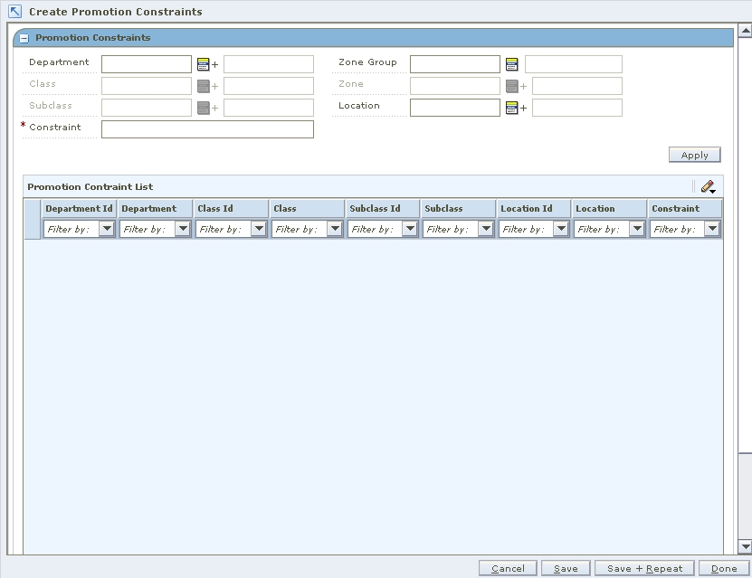 Navigate: From the Task Pad, select Promotion Constraints > Maintain Promotion Constraints. The Create Promotion Constraints workspace opens.