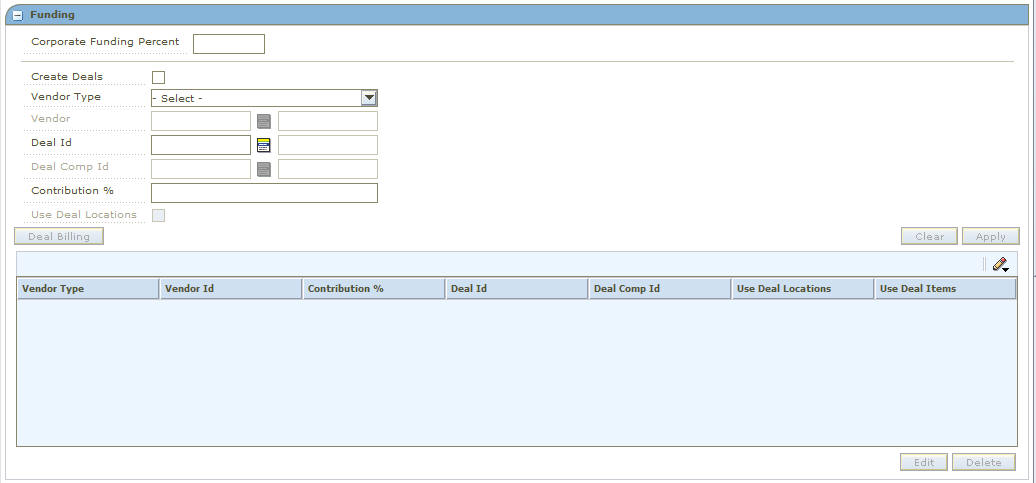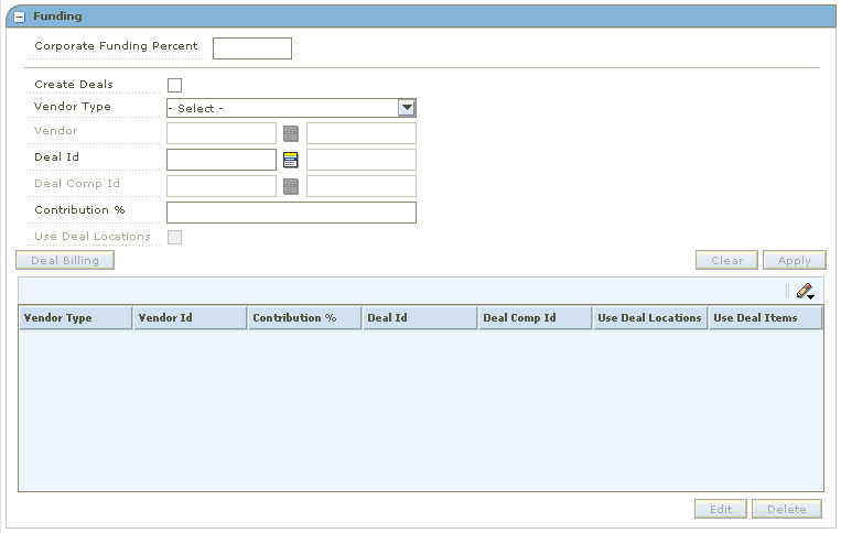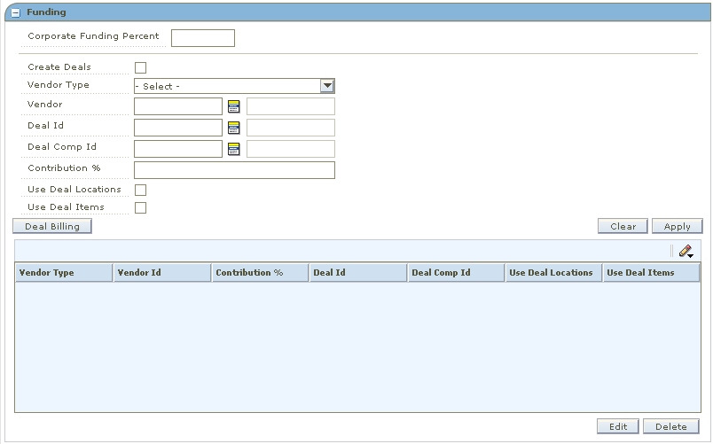 Funding is added to a promotion at the component level so that you can indicate the vendor that is contributing to the promotion. If you choose to create deals, based on the funded component, you must indicate the billing information for the deal. If the promotion is associated with an existing deal, the billing information defaults from the existing deal.