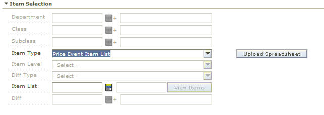 Note: If you select Item List from the Item Type drop down, only item lists will be selectable from the Item field. If you select Item, only single items that conform to the other criteria specified will be selectable. If you select Price Event Item List, an Upload Spreadsheet button displays.When an item list or price event item list is used during the creation of a price event, the system will apply the selected price guide to all items in the item list. There will not be any validation done to confirm that the selected price guide is a match for the selected departments. The results are that all items in the list will have the same price guide rules applied even if the price guide setup does not match for all items. |