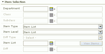 Note: If the Item Type is selected as Item List, the Item Level is defaulted to Item List and the Item Editor defaults to Item List. If Price Event Item List is selected, all other selection fields will be left blank and protected. |