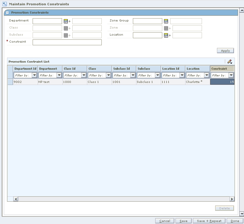 Navigate: From the Task Pad, select Promotion Constraints > Maintain Promotion Constraints. The Maintain Promotion Constraints workspace opens.