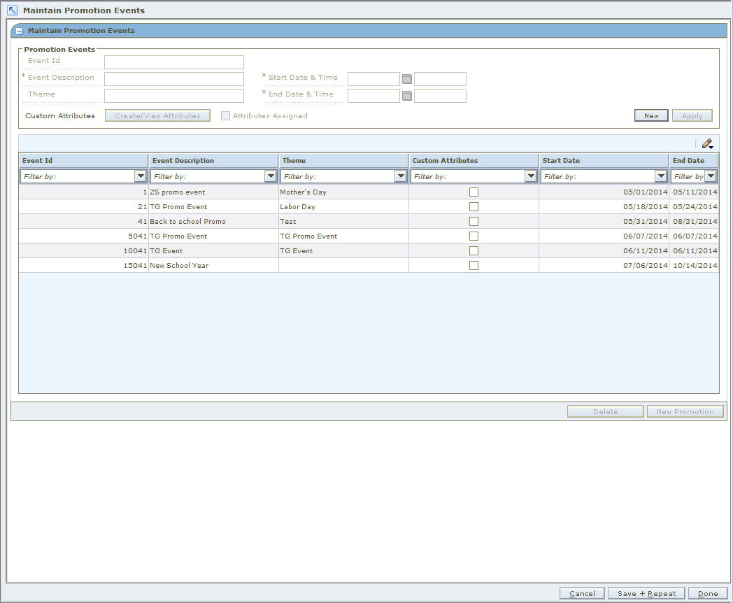 Navigate: From the Task Pad, select Promotion Events > Create/Maintain Events. The Maintain Promotion Events workspace opens.